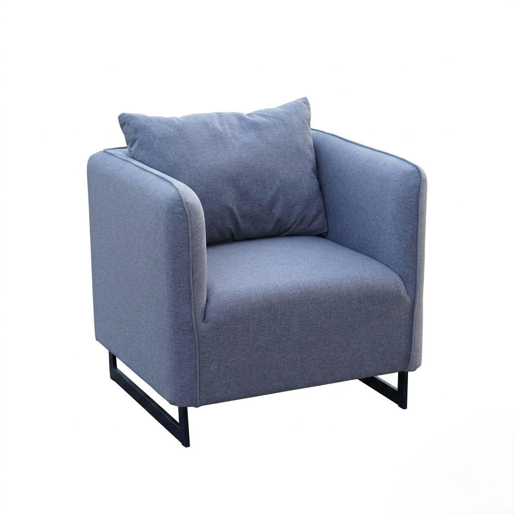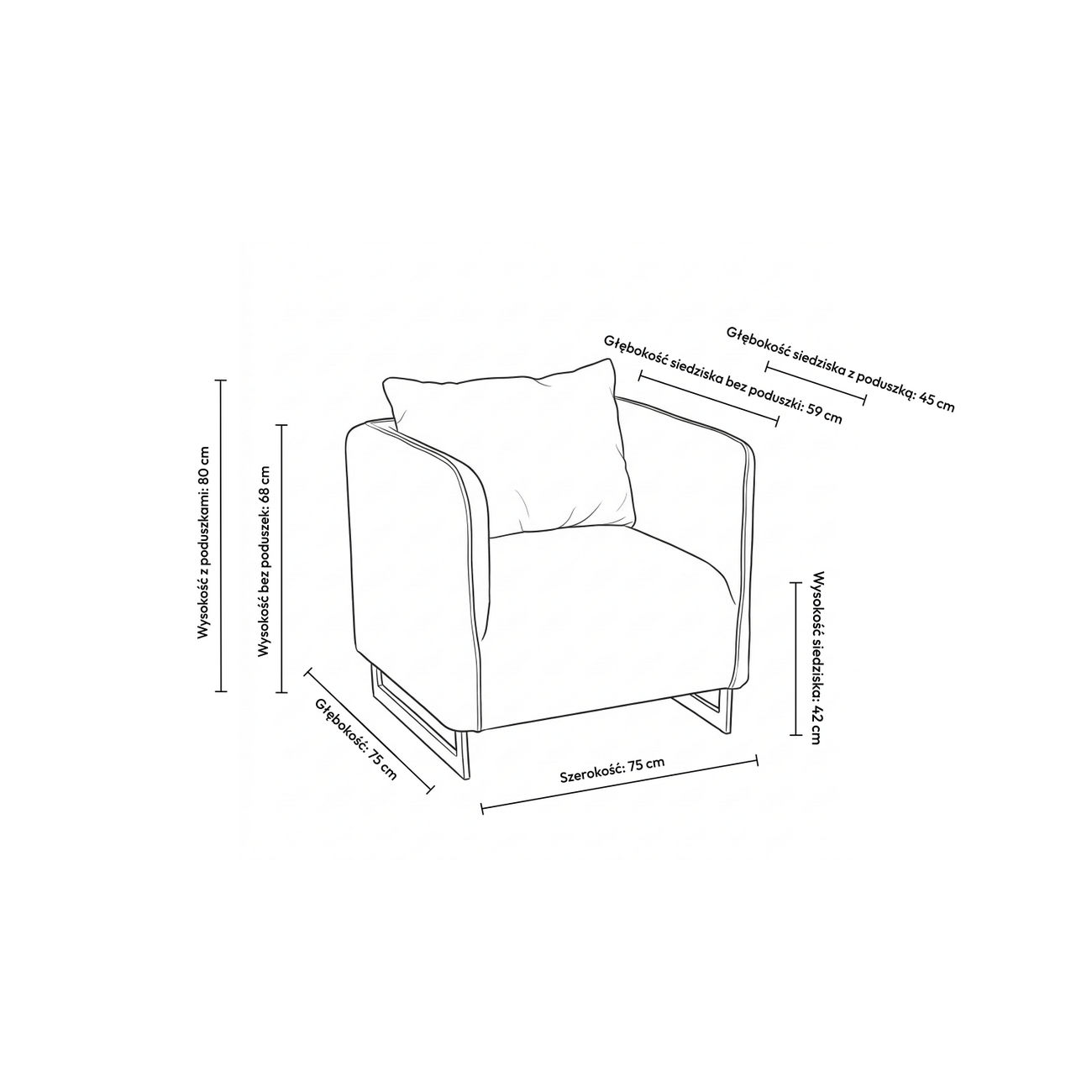 Fotel prezentuje się elegancko i nowocześnie – jasnoszara tapicerka w połączeniu z czarną, metalową podstawą idealnie wpisuje się w naturalne otoczenie ogrodu. Wyraźnie zarysowane, miękkie poduszki siedziskowe i oparciowe zapewniają wyjątkową wygodę, a jednocześnie utrzymują estetyczną, geometryczną formę mebla. Konstrukcja fotela osadzona jest na solidnej stalowej podstawie, która dodaje mu lekkości wizualnej i unosi go subtelnie nad powierzchnią tarasu.