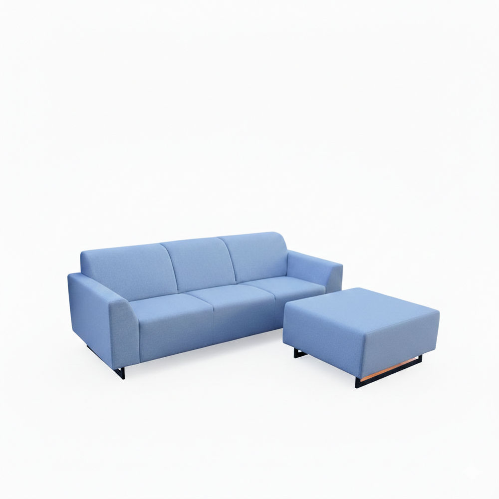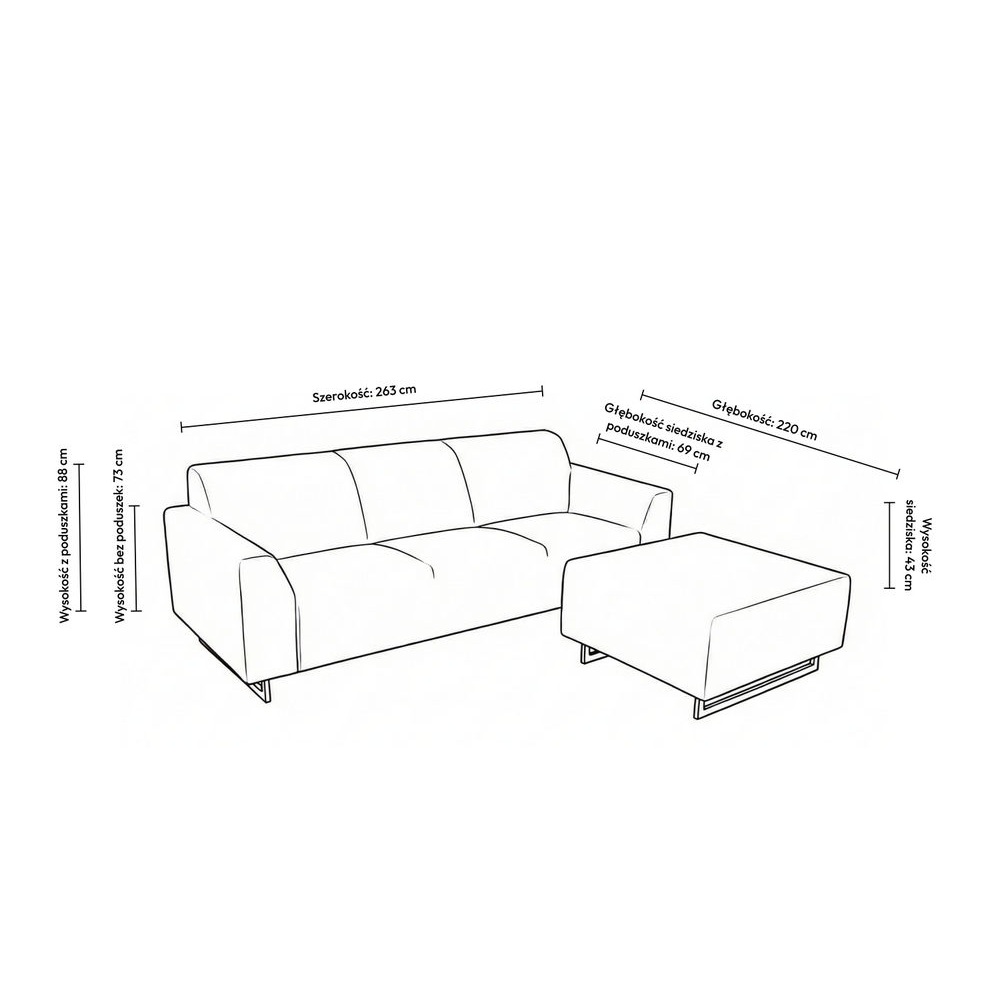 W skład zestawu wchodzi 3-osobowa sofa oraz hocker.