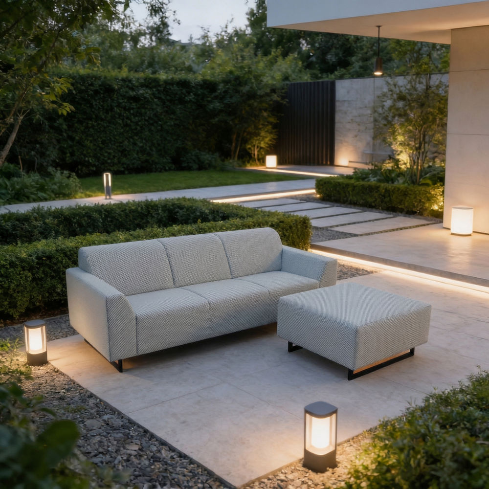 Sofa BARI prezentuje się wyjątkowo efektownie w otoczeniu zieleni. Jasnoszara tapicerka doskonale kontrastuje z ciemnym, drewnianym tarasem i naturalną zielenią w tle. Minimalistyczna bryła mebla z prostymi, szerokimi bokami i wysokim oparciem podkreśla jego nowoczesny charakter, a dołączony hocker (pufa) pełni funkcję podnóżka, stolika pomocniczego lub dodatkowego miejsca do siedzenia – według potrzeb użytkownika.