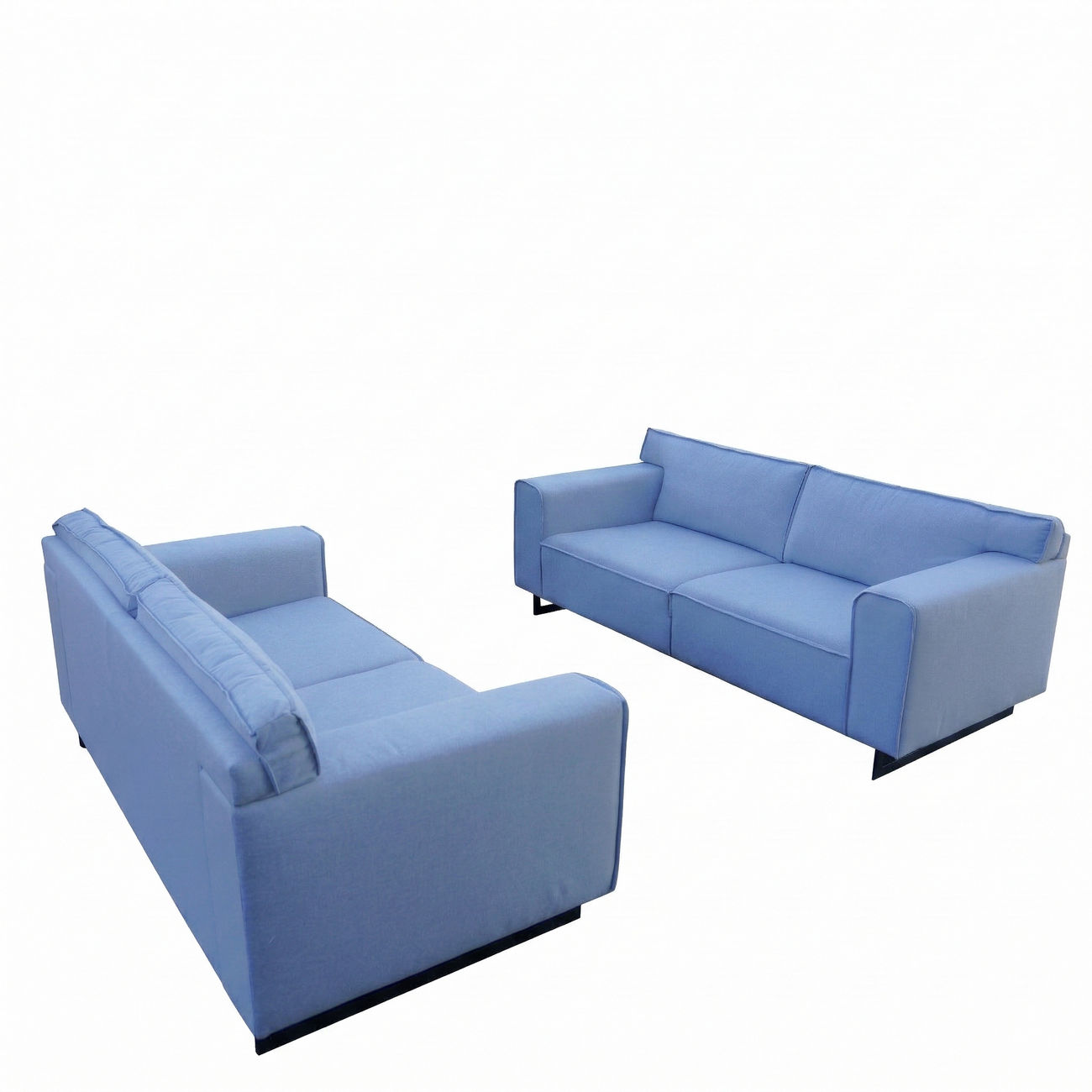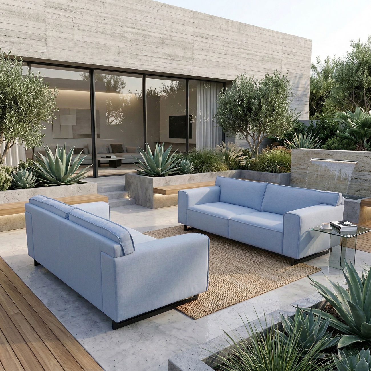 Zestaw wygląda niezwykle elegancko i harmonijnie. Wkomponowuje się doskonale w otoczenie bujnej roślinności i kwitnących krzewów. Gładka tapicerka tworzy stylowy kontrast z zielenią ogrodu, a prosta bryła z szerokimi podłokietnikami i dużymi siedziskami nadaje całości nowoczesnego charakteru. Wygodne poduszki oparciowe i siedziskowe zapewniają wysoki komfort podczas długiego odpoczynku – niezależnie od pory dnia.