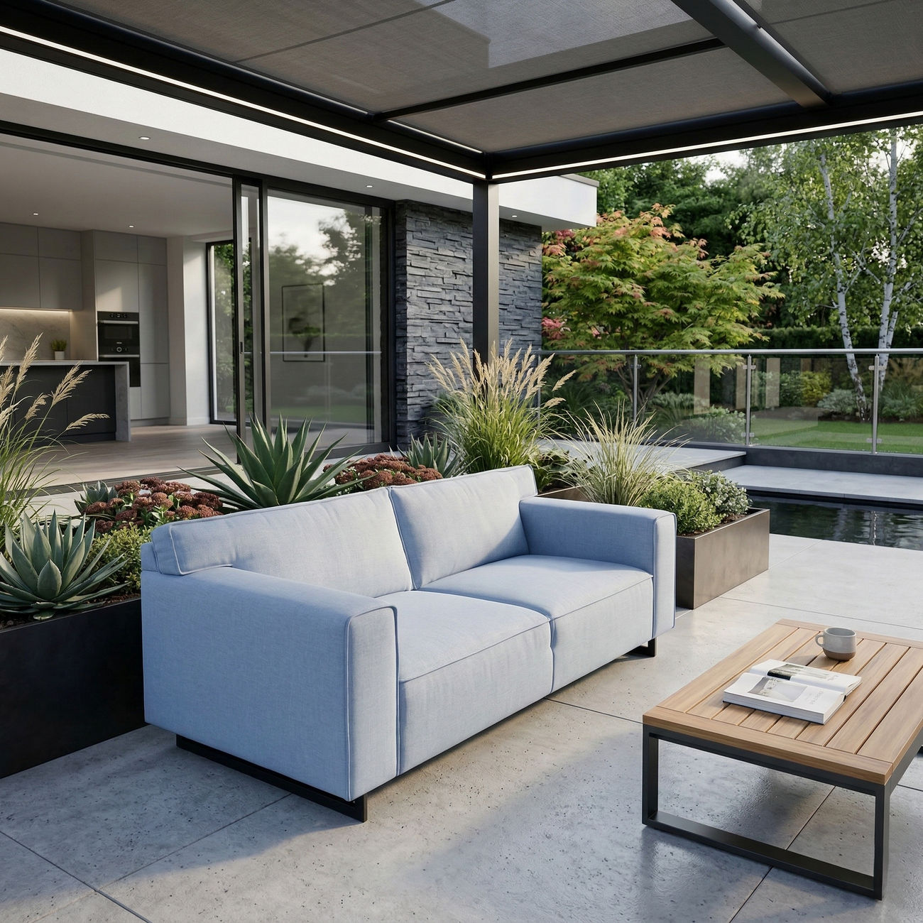 Styl: nowoczesny z nutą industrialnego minimalizmu – idealny do współczesnych tarasów, ogrodów i werand.